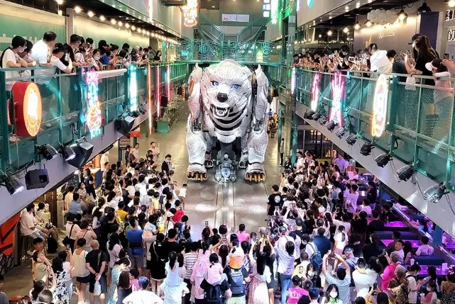 熊洞街以“大空間+小商業(yè)”為特色,匯聚了巨獸巡游、美食、娛樂、藝術、科技研學及潮玩等多元化業(yè)態(tài)。其核心IP——巨型機械白熊北北,以其震撼的體型成為街區(qū)焦點,引領游客穿梭于蒸汽朋克的奇妙世界。