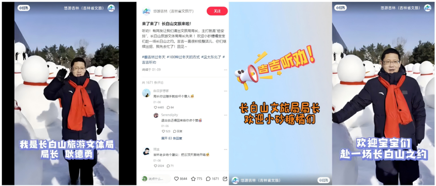 后有網(wǎng)友喊話“快讓長(zhǎng)白山跟一波熱度”,吉林文旅現(xiàn)場(chǎng)“搖人”,長(zhǎng)白山旅游文體局局長(zhǎng)隨即拍攝歡迎視頻,再次實(shí)戰(zhàn)“聽(tīng)勸式營(yíng)銷”。