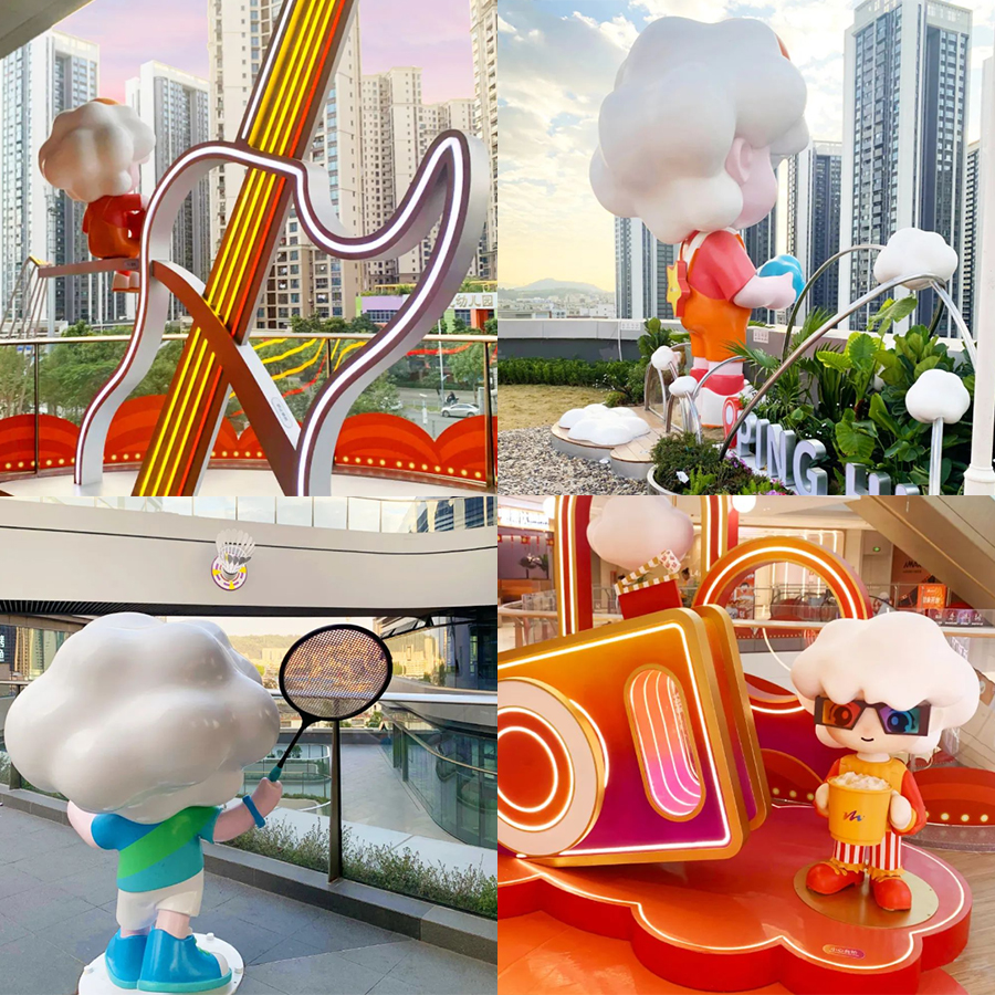有趣的是,項(xiàng)目還推出了原創(chuàng)IP「多多」,作為項(xiàng)目與消費(fèi)者對話的符號,以云朵為靈感,化身不同的角色,串聯(lián)起星空廣場、藝術(shù)連廊、屋頂公園等戶外空間場景,使獨(dú)特的記憶符號變得豐滿,憑無界創(chuàng)意加速突破商業(yè)空間界限,賦能多元互動體驗(yàn)場景。
